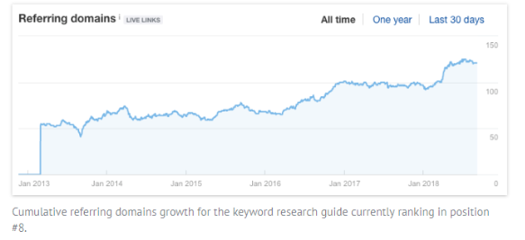 This graph below by Ahrefs shows the pace at which the number one ranking page for query “keyword research” gets links over time.